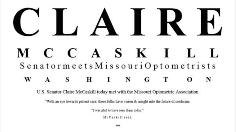 Today, Missouri Sen. Claire McCaskill’s staff remembered to find joy in their work. In honor of a meeting with the Missouri Optometric Association, they made a press release that looks like an eye chart! That’s it! That’s all it takes to charm me!