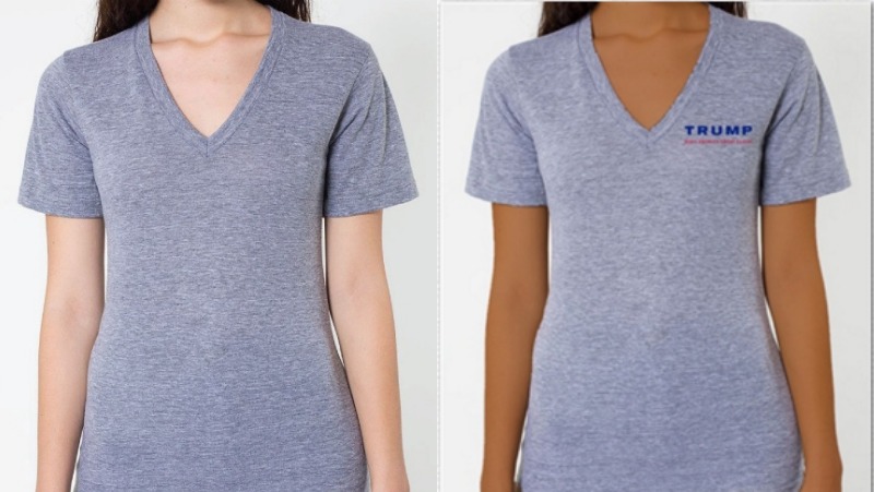 The image on the left is taken from Trump’s apparel store. The one on the right is from the online shop for jcgapparel, a custom printed apparel company.