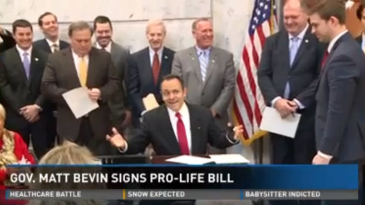 Bevin signing the informed consent provision; screenshot via WHAS.