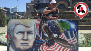 CLEVELAND — “Art creates conversation,” Julian Raven, a painter from upstate New York tells me. Raven, an alternate delegate and true Donald Trump believer, drove the print of the original 8' x 16' painting from his Elmira studio which apparently has a 25-foot Trump banner hanging outside of it. He’s standing on a Civil War memorial in the middle of Cleveland’s Public Square on Tuesday afternoon among a handful of protesters, dozens of cops, and Univision’s Jorge Ramos interviewing a white supremacist.
