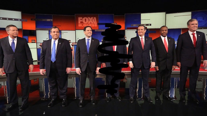 This evening will be notably lacking Donald Trump, a.k.a. the Alison DiLaurentis of the group (I just started watching Pretty Little Liars!) a.k.a. the popular, chatty, outrageous one who binds the girls together and dictates the group’s energy. Now that he’s left them behind (you can follow along with a live blog of his protest-cum-narcissistic wank off here), what will become of the others? Will John Kasich act out or stick to the talking points? Will Jeb Bush finally express an opinion? Will Ted Cruz unzip his skin and reveal that he is just a pile of used napkins? Will Chris Christie explode like a rocket and shoot through the ceiling?