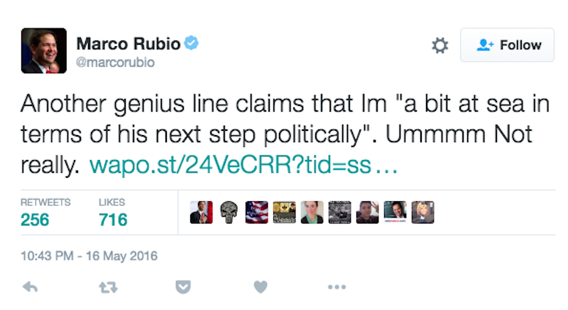 In a meandering, somewhat arbitrary list of politicians who the Post says will “never” be Donald Trump’s vice president, Chris Cillizza spoke to unnamed sources “close” to Rubio and declared him “sort of betwixt and between when it comes to his next move.” According to Rubio, these unnamed sources do not know him and do not know his life, and why doesn’t the media just go die?!