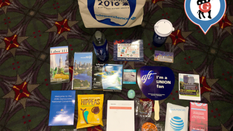 Off to one side of the building, a group of protesters huddled around a small, black portable speaker held in the air by a confident woman, listening to a Sanders speech—either the one he was giving concurrently to a group of delegates, or one that he had given in the past that they had recorded for posterity.