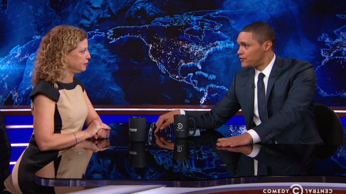 Democratic National Committee Chair Debbie Wasserman-Schultz was a guest on The Daily Show on Monday night, and it seems like they had a hardball interview in mind—Wasserman-Schultz is a controversial figure within the party these days, having faced criticism for a light debate schedule that appeared to favor Clinton; when my colleague Joanna Rothkopf and I attended a Democratic primary event in New Hampshire, Wasserman-Schultz was loudly booed.